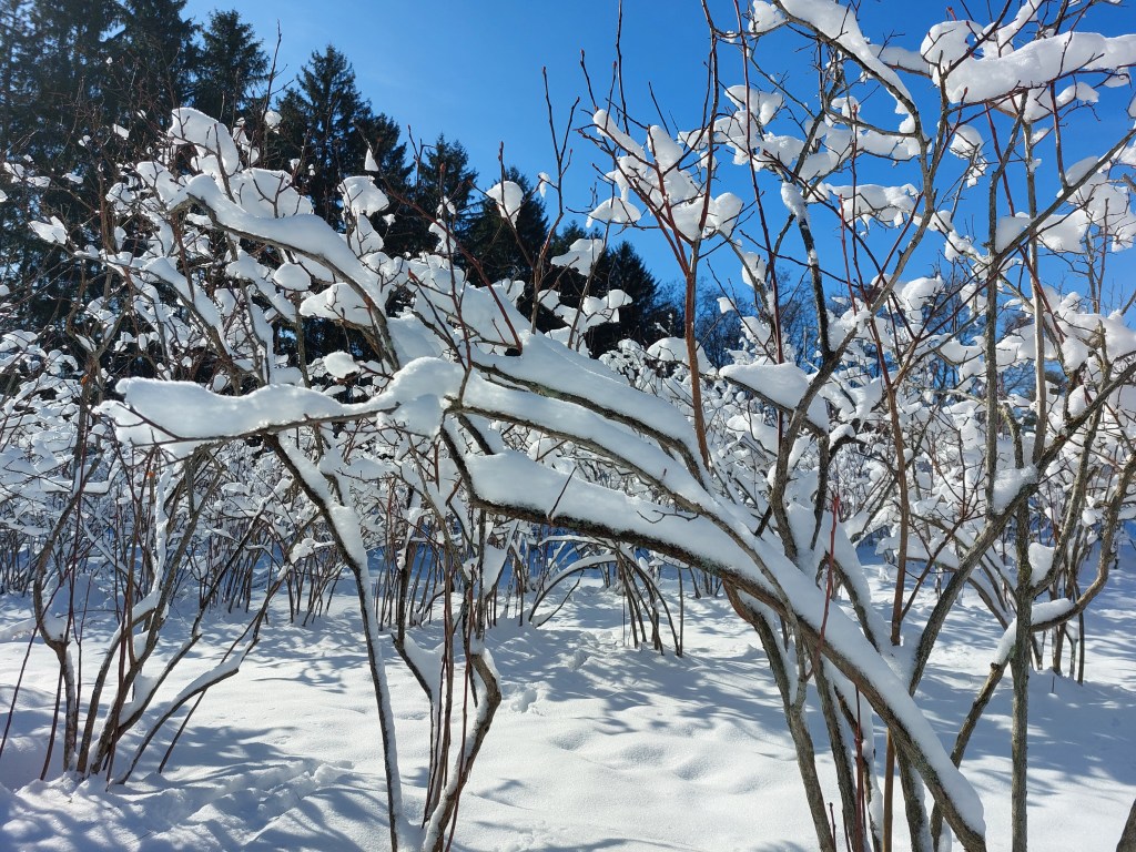 Looking out over the winter patch, it is hard to believe these snow-covered bushes will be dripping with tasty all-natural blueberries in just a few months.